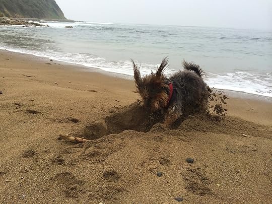 Doesn't look so menacing from below, does it?I brought Jack the second time, and third, and fourth, and now whenever the car gets near that cliff his mood picks up and he can’t wait to get out of the car and onto the trail. Once we are on the beach I throw the Frisbee for him, he digs huge holes in the sand, he sprints through the surf, and he barks his little heart out with happiness. While he is doing his thing I am doing mine. Instead of going to the dark and sad yoga studio I do my yoga poses in the sunny cove, while looking for breaching whales out on the water, meditating, and just being grateful in general that we can access this beauty and space right here just ten minutes from our little house.