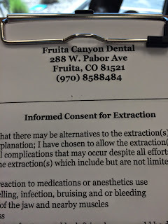 The closest exit was for the town of Fruita, Colorado. We took it. We parked. And we plugged our ears as the hail continued to pound the roof like a musical accompaniment to my throbbing tooth. While we waited out the storm I started Googling dentists nearby. I called at least 4 places until I got an appointment just 30 minutes later. And not in the bigger city of Grand Junction just 10 miles down the road, but in this very small town (pop. 12,700) I had never heard of, never planned on stopping in.