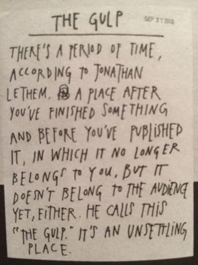 I loved "Show Your Work," but it wasn't until I got to the "Behind the Scenes" section at the very end that I experienced my "Aha!" moment. Here, Kleon outlined his creative process and showed some "outtakes." He describes something Jonathan Lethem said (remember: give credit to the people you quote) and it resonated with me. Deeply. Not only that, it helped. It gave me comfort. Relief. Inner peace. Someone had perfectly and precisely described what I've been feeling these past two months. He even had a name for it: The Gulp.
