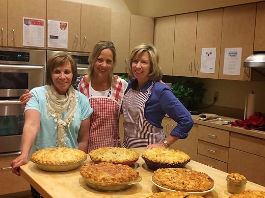 Our beautiful pie class host, Lorrie Rockwell (right)I had two TV appearances and a pie class to teach my first day in Phoenix. The class was a special one in that a longtime Facebook fan, Lorrie Rockwell, offered the kitchen space in the Hospice Center where she works. Two ovens and six tables provided the perfect venue. But the evening wasn’t really about the pie. It never is. It was about the fellowship and new friends that came out of the experience. Besides Lorrie, who was so gracious and welcoming (and pretty!), there were two women I met on RAGBRAI last summer. I had escaped from my pie stand responsibilities for two days last July to join in the “Register’s Annual Great Bike Ride Across Iowa.” While pedaling along with the tens of thousands of other cyclists I rode behind a woman, a strong rider, who every time she came upon those grooves in the pavement that warn drivers of a stop sign, she called out to those behind her, “RUMBLE STRIPS!!!!” I ran into her at a roadside watermelon stand later and I recognized her. “Oh, hi. I know you. You’re Rumble Strips,” I teased. We struck up a conversation — her name is Candace — and then met her friend Martha who she was with. I learned they were from Phoenix. We traded contact info and when I knew I was going to be in Phoenix on my book tour I invited Candace and Martha to come to the class. And they did. What a surprising and special connection!
