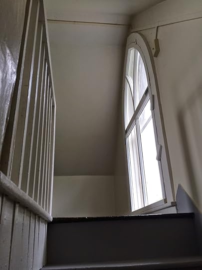 Heading upstairs to bed, you're greeted by a second Gothic window. But watch your head! The stairway is steep and the ceilings are low.