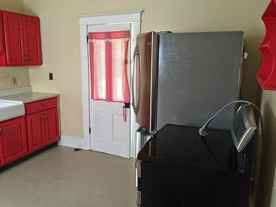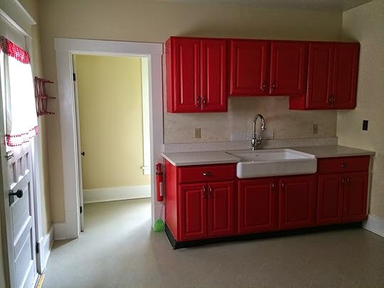 It's a small but mighty kitchen. I painted the cupboards red, which I LOVED.And check out that gorgeous sink and faucet, donated by Kohler. What a