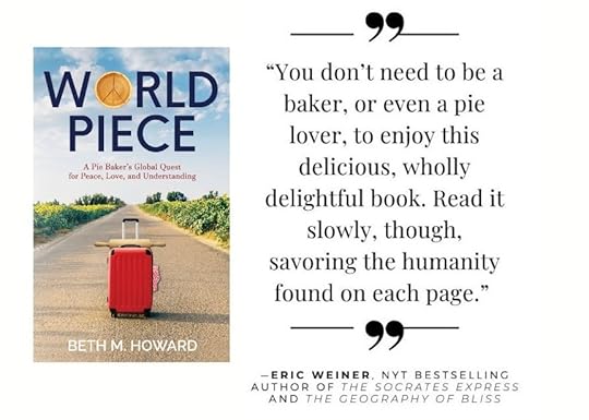 People are already saying glowing things about the book“A book about pie? Yes, but Beth Howard’s delightful and delicious World Piece is much more than that. It is about being scared and senseless by the thought of doing something—and doing it anyway. It is about the terrible persistence of grief, the transformative power of travel, and the love of a good dog. It is about leaving home in order to find it. Beth Howard is the Marco Polo of the baking world. With her trusty rolling pin in hand, she circles the globe in search of peace—the absence of war, yes, but also the more elusive peace of mind. She writes with a keen eye and open heart, leavening her tale with dollops of humor. World Piece is part travelogue, part culinary adventure, part love story—and wholly delightful. You don’t need to be a baker, or even a pie lover, to enjoy this delicious book. Read it slowly, though, savoring the humanity found on each page.”