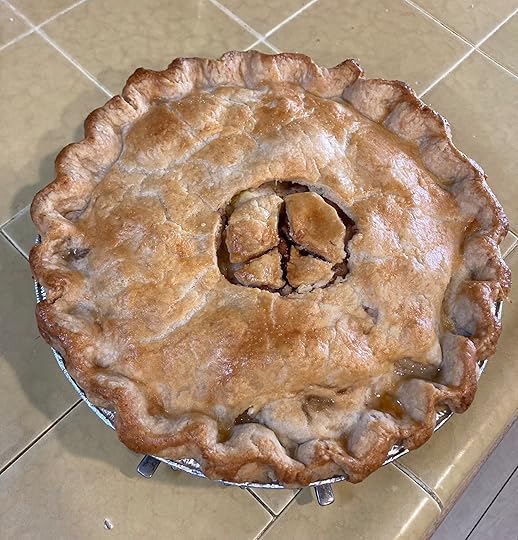 Allison sent me several emails after our lunch. The first one said, “I am still gobsmacked that you made me a pie. That’s a first in my 71 years. It’s so beautiful. I took a photo of it and am going to have a slice for breakfast and share it with my new neighbors.”