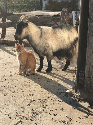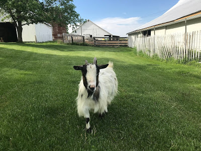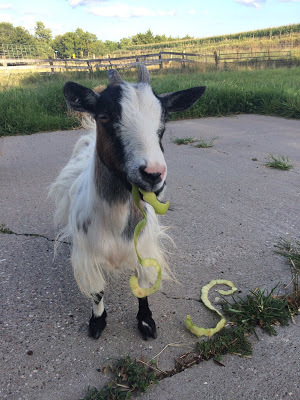 When the two males, Mr. Friendly and Chaps, see me coming they rear up on their hind legs and head butt each other, slamming their horns so hard the smacking sound echoes off the barn. I first thought this was an act of aggression, but after observing it repeatedly, always in this context of me bearing breakfast bowls of grain, I realized it was the goat version of a high five.