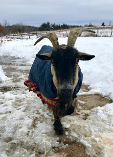 Chaps in his new coat“Every day is a bonus, Bea,” Doug says.Every day I have been spending a lot of extra time in the goat pen with Chaps and Friendly. I have been bringing them warm water with molasses, and increased their feed. I have been petting and petting and petting them, like some massage therapist for goats. And I bought a new sewing machine to make coats for them out of old fleece blankets and nylon tarp. (Making the coats was so easy I wished I had made them three years ago.)