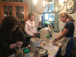 This is what peaceful and rural looks like.Bentonsport resident Betty Printy—also a potter, weaver, and gardener—was our bread instructor who hosted the class in her home, an historic two-story brick and beam house built in 1869. Stepping through her doorway was to enter another world, indeed a simpler one—and safer one. Surrounded by Betty’s antiques—from her 1935 Magic Chef white enamel gas range to her ceramic butter churns and rooster figures to her cuckoo clock—and enveloped in the sweet fumes of her scented candles, I wanted to spend more time here than the four hours allotted for the class. I wanted to move in! Except that I knew from having met Betty before that she had bull snakes living in her basement, in her laundry room, just like I did when I lived in the American Gothic House. Uh, no thanks. Been there, done that.