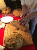 The Victory Shot.The four-hour class ended with a victory shot. Instead of taking pictures of my pie students, capturing their beaming smiles of pride as they stood behind their freshly baked beauties, it was me in the shot this time standing behind my spectacular (if I may say so myself) golden brown boule of wheatberry sourdough, smiling with pride. I was even saying the very thing I loved hearing my own students say, the thing that makes the teaching so fulfilling, the thing that must have made Betty feel good about her efforts. I said—we all said, "I can't believe I made this!"Steaming and fragrant, the yeasty scent wafted up in my nostrils. I was tormented with desire, desperate to rip off a hunk and shove it right into my salivating mouth. I managed to maintain my manners and waited until I got home to indulge. (Anyway, I had eaten several slices of Betty’s bread during the class so I wasn't exactly starving.)