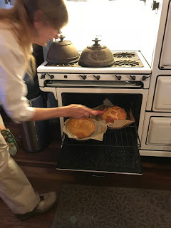 I was not so lucky at home, unsupervised without Betty's gentle guidance and instant answers to my questions, like, "Is it okay to use a packet of yeast that's six months past its expiration date?" I stepped through each stage—setting and resetting the timer on my iPhone, running downstairs every 30 minutes to “stretch and fold” the dough, transfer the dough to another bowl to rise some more, preheat the oven to 430 degrees, and finally tuck my baby into a cast iron Dutch oven for baking. My dough did not double in size. Was the room too cold? Was it because of the expired yeast? I did not have parchment paper so I used the “other” method of lining my Dutch oven with cornmeal. The oven smoked so much while the bread baked that the smoke alarm went off and sent the dogs into a panic. I had to open the doors to air out the house, and because it was a 25-degree winter day, the smoke was replaced with a stinging icy breeze.