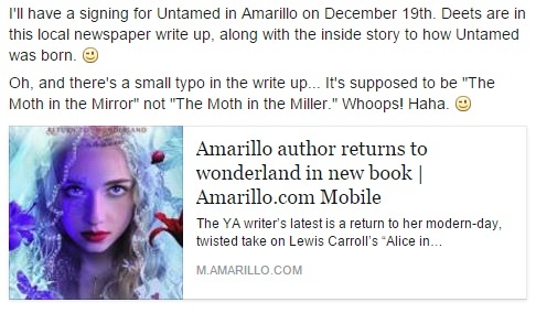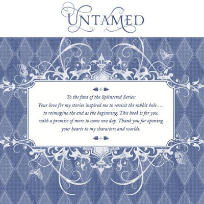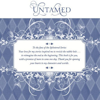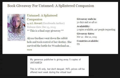 Nov 16: Revisit Wonderland settings /citizens + scavenger hunt for INTL prizesNov 17: Revisit the main characters + scavenger hunt for INTL prizesNov 18: Untamed playlist revealNov 19: Untamed book trailer reveal + INTL giveawayNov 20: Untamed first chapter reveal + INTL giveawayAt each stop, my publisher will also have a rafflecopter with a chance to win one of 10 Untamed hardbacks and one of five Untamed posters domestically.