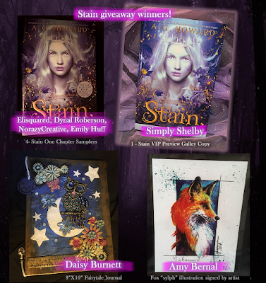 Congrats to the winners, and there's a Stain blog tour on the horizon where we'll have another giveaway, so stay tuned! Also, in case you missed the announcement, there's a Stain preorder gift that's in the works, and if you enjoyed Splintered or Alice in Wonderland, you'll want to...