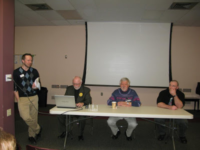 Mathew Bose is the reference & adult services librarian at Hooksett Public Library, author Richard Hatin, author Joe Smiga, and M.R. Gott at the Hooksett NH Library on November first 2012.