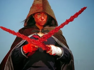 Well, that is if you don’t get offended too easily (or have Mary Shelly and Bram Stoker finished rolling over in their graves yet?). You see, everything in this film is excessive. Everything. Yet part of the point is that’s the way it is in Japanese society, especially with teens. There are the ganguros, for instance, girls who paint or tan their faces a deep brown-black, wear white lipstick and eye shadow, and otherwise emulate American Blacks who here take their models, seemingly, from 1930s cartoons. And then there’s wrist-cutting (“Wrist cut is very popular in Japan,” according to one source. “Some people attempt ‘Wrist cut’ for autoside, but many people do ‘Wrist cut’ to ensure they are living. Japan is very controlled society. It is difficult to feel that people live their own life.”), which here includes a sanctioned school team and competitions to see who can fill buckets the fullest with blood (the girl who cuts her arm entirely off is not the winner!). And then there’s the teacher from China who has super lungs from all the pollution on the mainland, so much so that he can smoke ten cigarettes all at once. These things, believe it or not, turn out to play an important part in the film’s denouement.