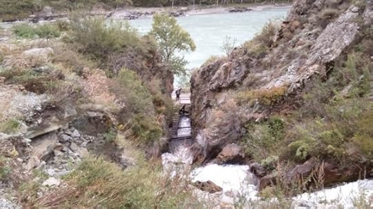 Достопримечательностью его делает место, где он находится - Тельдекпенские пороги! Здесь Катунь течет по глубокой скальной трещине с отвесными берегами. Ширина реки всего-навсего два десятка метров. Зато глубина, если местные жители не врут, составляет аж семьдесят метров! Похоже на правду. Если взглянуть на Катунь выше и ниже по течению, там она разливается в берегах на сотню-другую метров и всё равно остается достаточно глубокой. А у моста скалы зажали ее в тисках, поэтому не мудрено, что тут река вглубь гораздо больше, чем вширь.