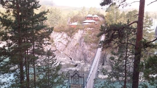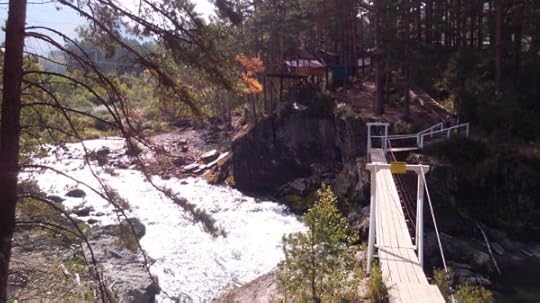Спускаемся обратно и продолжаем бесцельно слоняться по берегу. Не доверяя местному Интернету, покупаем в сувенирной лавке карту Горного Алтая с отмеченными на ней достопримечательностями. Затем пересекаем Чемал в обратном направлении, только уже по бесплатному мосту.