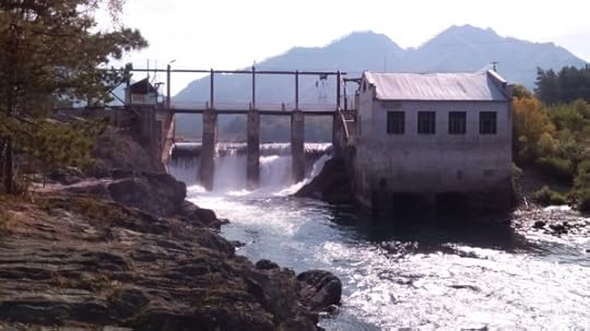 Доезжаем до Еланды, где напрочь отсутствует мобильная связь. Минуем деревню, а затем фундамент Катунской ГЭС, чье сооружение было заброшено еще до развала СССР. Проскакиваем мимо каких-то больших дыр в придорожной скале. Что это было? Ладно, на обратном пути посмотрим. Чуть дальше обнаруживаем слева по борту в горе бетонную арку - вход не то в пещеру, не то в шахту. А справа - маленькая речная заводь и песчаный пляж.