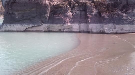 Солнце печет не по-осеннему и хочется искупаться. У подножия огромной скалы натыкаемся на заводь с песчаным пляжем. В нее захлестывают волны от ближайшего порога, отчего здесь даже есть прибой! Как мило. Вот только дна не видать, а прощупать его можно разве что ногами.