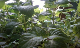 Those collection of plants include a variety of herbs, a few peppers, a cherry tomato, cabbages and brussel sprouts.