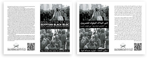 إن الانتقادات التي توجه إلى البلاك بلوك في مصر مألوفة بشكل زائد عن اللزوم لنا – لقد شاهدنا رجعيين يقرؤون من نفس السيناريو منذ عام 1999. أنتم تُلامون على عنف الشرطة، في الوقت الذي يكون فيه رجال الشرطة عنيفين كما يجب أن يكونوا بالضبط ليحافظوا على تفوقهم، وعنفهم المستمر يظهر للعيان فقط لأنكم تقاومونه. هؤلاء الذين يملكون امتيازات وقوة أكثر منكم يتهمونكم بأنكم عيال أثرياء مدللون. هؤلاء الذين هم غير راغبين في التعرض لنفس المخاطرات يتهمونكم بالجبن. هؤلاء الذين لديهم أهداف مختلفة عنكم يشتكون من أنكم غير استراتيجيين. هؤلاء الذين تعني الديمقراطية لهم تضخيم أصواتهم يصرون على أنكم يجب أن تخضعوا لحكم الأغلبية لكي يسكتوكم. هؤلاء الذين يعتمدون على المساعدات العسكرية الأجنبية، والذين ينحنون أمام الضغوط السياسية الأجنبية لبيع شعب مصر، يتهمونكم باستيراد تكتيكات أجنبية. قبل كل شيء، تفعل السلطات من كل نوع كل ما يمكنها فعله لعزلكم عن الآخرين الذين من المحتمل أن يشتركوا في المقاومة.