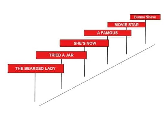 Some of you will remember this clever advertising campaign, which lasted from 1925 until 1963. The rhyming jingles for a brushless shave cream were displayed on a series of small wooden signs spaced 100 feet apart along roadways across rural America.