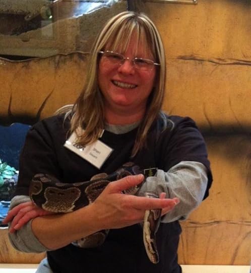 Last Sunday while volunteering at the zoo, a thirty-something woman touched Damien. She has always been afraid of snakes, and said she'd never touched a snake in her life. It made me feel good, and from what I could tell, she felt GREAT. That is one of the most fun things about being a zoo docent - offering people positive animal experiences that they might otherwise not have. Several weeks ago, it was a man in his fifties who was convinced to touch a snake for the first time. Again, that snake was Damien. He's a very docile snake, calm and sweet, and very used to being handled by trained docents.