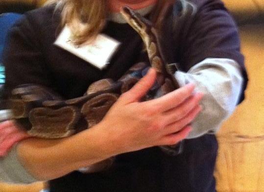 An interesting thing about snakes... when you're holding them, they don't ever really stop moving. Even if they're moving slowly, they're still moving, and you have to readjust your arms quite frequently. And Damien is heavy - a half an hour holding him is long enough. Probably long enough for him, as well, because by the end of a half hour, a coil of his boy was locked so tightly around my wrist that I was unable to slide my hand free (he was very likely sucking up my body heat). But Damien's so cool that I just set him and my arm into his exhibit, and he released me to go find his favorite corner.How does a docent convince someone to touch a snake for the first time? Well. It's not that hard. I just tell them exactly what Damien's skin feels like - a shiny basketball. Or a basketball that's been wiped with armor-all - you know, that weird stuff you clean the inside of your car with? Yeah, that. Snakes are shiny, not slimy. People are often surprised about that. They also (well, Damien, at least) don't slither or slide so much as move with a series of muscle contractions, or at least that's what it feels like when holding one coiled around one's arms.