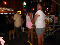 It was a day party - in our neck of the woods, we call it a "pub crawl" - a bunch of friends crawling from bar to bar, drinking and dancing and having a great time. A New Yorker told me these are actually illegal. This one was hysterical. There were, I don't know, 25 - 30 black women, all dressed as if they'd come straight out of a whore house. The skirts were short, the shirts were tight, and the heels were high. And they were having a ball. The pic at the left is the LEAST shocking - the gal at the far left with the mesh dress? The front was mesh too, except for built-in nipple pasties...Honestly, we have never seen such a group of skimpily, tackily dressed women. And without intending to be mean, I have to say that we laughed so hard there were moments we were pretty much doubled over. It was quite a sight for a couple of mid-western girls, let me tell you. We desperately wanted to take pictures, but it was hard to figure out how to do that without insulting people.