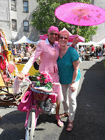 Sunday we went to a street fair in Hell's Kitchen, which was a lot of fun. I drank a watermelon/strawberry smoothie thing that was refreshing and cold. The weather was beautiful - as it had been every day. I bought an iPhone case that has a picture of Steve Jobs on the back. I don't know why, but it seemed like the right thing to do, considering Steve Jobs changed our world.We also walked down to the permanent flea market, also in Hell's Kitchen. Took an awesome picture of my mom with a transvestite. (See? Gay poetry reading on Saturday, smiling next to a tranny on Sunday - I'm definitely broadening my mom's world).