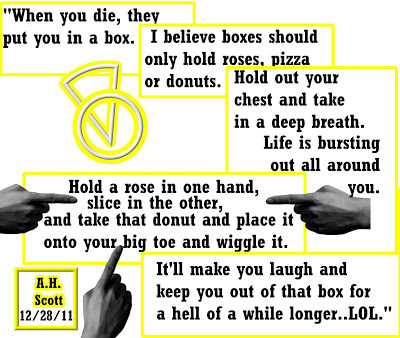 "When you die, they put you in a box. I believe boxes should only hold roses, pizza or donuts. Hold out your chest and take in a deep breath. Life is bursting out all around you. Hold a rose in one hand, slice in the other, and take that donut and place it onto your big toe and wiggle it. It'll make you laugh and keep you out of that box for a hell of a while longer..LOL." - A.H. Scott 12/28/11