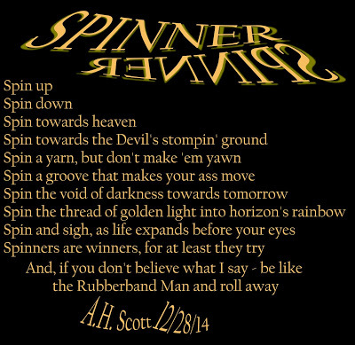 Spin upSpin downSpin towards heavenSpin towards the Devil's stompin' groundSpin a yarn, but don't make 'em yawnSpin a groove that makes your ass moveSpin the void of darkness towards tomorrowSpin the thread of golden light into horizon's rainbowSpin and sigh, as life expands before your eyesSpinners are winners, for at least they tryAnd, if you don't believe what I say - be like the Rubberband Man and roll away