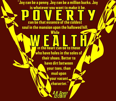 "Joy can be a penny. Joy can be a million bucks. Joy is whatever you want to make it be. Poverty can be that essence of the coldest soul in the mansion upon the hallowed hill. While wealth in the heart can be to those who have holes in the soles of their shoes. Better to have dirt between your toes, than mud upon your vacant character." - A.H. Scott 12/28/11
