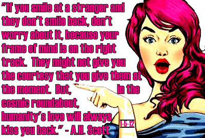 "If you smile at a stranger and they don't smile back, don't worry about it, because your frame of mind is on the right track. They might not give you the courtesy that you give them at the moment. But, in the cosmic roundabout, humanity's love will always kiss you back." - A.H. Scott 1/5/12