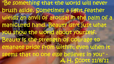 "Be something that the world will never brush aside. Sometimes a light feather wields an anvil of arousal in the palm of a manicured hand. Beauty isn't just what you show the world about yourself. Beauty is the strength of courage to emanate pride from within; even when it seems that no one else believes in you" - A.H. Scott 11/8/11