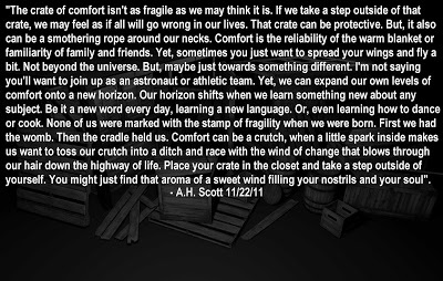 "The crate of comfort isn't as fragile as we may think it is. If we take a step outside of that crate, we may feel as if all will go wrong in our lives. That crate can be protective. But, it also can be a smothering rope around our necks. Comfort is the reliability of the warm blanket or familiarity of family and friends. Yet, sometimes you just want to spread your wings and fly a bit. Not beyond the universe. But, maybe just towards something different. I'm not saying you'll want to join up as an astronaut or athletic team. Yet, we can expand our own levels of comfort onto a new horizon. Our horizon shifts when we learn something new about any subject. Be it a new word every day, learning a new language. Or, even learning how to dance or cook. None of us were marked with the stamp of fragility when we were born. First we had the womb. Then the cradle held us. Comfort can be a crutch, when a little spark inside makes us want to toss our crutch into a ditch and race with the wind of change that blows through our hair down the highway of life. Place your crate in the closet and take a step outside of yourself. You might just find that aroma of a sweet wind filling your nostrils and your soul". - A.H. Scott 11/22/11