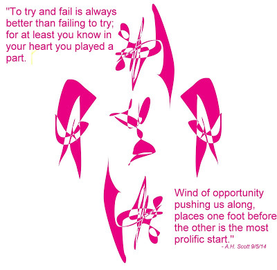"To try and fail is always better than failing to try; for at least you know in your heart you played a part. Wind of opportunity pushing us along, places one foot before the other is the most prolific start." - A.H. Scott 9/5/14