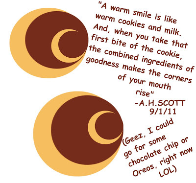 "A warm smile is like warm cookies and milk. And, when you take that first bite of the cookie, the combined ingredients of goodness makes the corners of your mouth rise" - A.H. Scott (Geez, I could go for some chocolate chip or Oreos, right now...LOL.