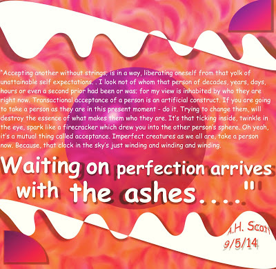 “Accepting another without strings; is in a way, liberating oneself from that yolk of unattainable self expectations. I look not of whom that person of decades, years, days, hours or even a second prior had been or was; for my view is inhabited by who they are right now. Transactional acceptance of a person is an artificial construct. If you are going to take a person as they are in this present moment - do it. Trying to change them, will destroy the essence of what makes them who they are. It’s that ticking inside, twinkle in the eye, spark like a firecracker which drew you into the other person’s sphere. Oh yeah, it’s a mutual thing called acceptance. Imperfect creatures as we all are, take a person now. Because, that clock in the sky’s just winding and winding and winding. Waiting on perfection arrives with the ashes…” – A.H. Scott 9/5/14