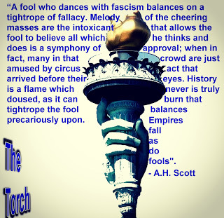 “A fool who dances with fascism balances on a tightrope of fallacy. Melody of the cheering masses are the intoxicant that allows the fool to believe all which he thinks and does is a symphony of approval; when in fact, many in that crowd are just amused by circus act that arrived before their eyes. History is a flame which never is truly doused, as it can burn that tightrope the fool balances precariously upon. Empires fall as do fools” – A.H. Scott