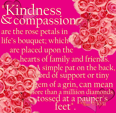 "Kindness and compassion are the rose petals in life's bouquet; which are placed upon the hearts of family and friends. A simple pat on the back, word of support or tiny gem of a grin, can mean more than a million