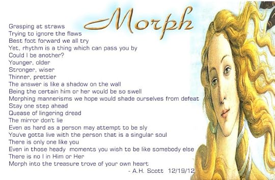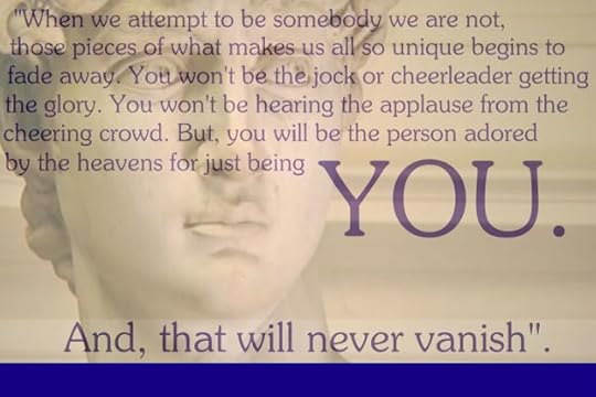 "When we attempt to be somebody we are not, those pieces of what makes us all so unique begins to fade away. You won't be the jock or cheerleader getting the glory. You won't be hearing the applause from the cheering crowd. But, you will be the person adored by the heavens for just being you. And, that will never vanish". - A.H. Scott 12/19/12