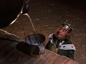The story begins in earnest when Darby tells the pub how he once caught the King of the Little People, King Brian, up at the castle ruins on the hill one evening. He even got his wish of a crock of gold, before he was tricked into making a fourth, and forfeit them all. But King Brian hasn’t forgotten him- and when he learns that he’s being put out to pasture, he puts a glamor on Darby’s horse so he knocks him down a well that leads to the land of the Little People. Down there, the King tells him he must stay forever. Thus begins the best part of the story- how the 4,000-year old king of the leprechauns and clever old gaffer Darby O’Gill, as they continually trick each other.