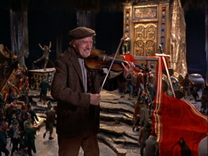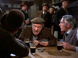 First Darby has to trick his way out to the real world again, and once he does, he needs to keep King Brian (the perfectly cast Jimmy O’Dea) from dragging him back, so they have a whiskey-drinking and rhyming contest till dawn. Once there’s daylight, the leprechaun’s powers are gone, and Darby just needs to sic the barn cat on him to get his way. From then on he’s got the king in a sack, and the battle is on to see if he can get any of his wishes before the King can make him waste them all! It’s great fun, interspersed with the chaste romance of Katie and Michael, set on the Disney backlots with some nice matte paintings reminiscent of Ireland. Having been there, the castles and ruins stood out as unlikely, but I could imagine a ring fort instead.