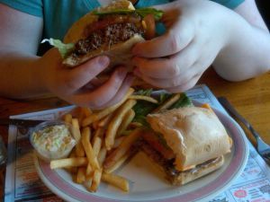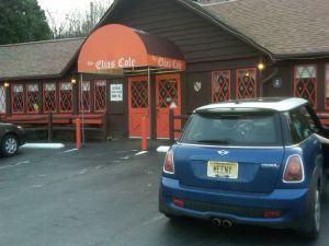 So when I was driving to High Point State Park for a hike with Firecracker and saw the garish brown and orange cabin decor of The Elias Cole, I knew I had to stop there for a bite. I’d seen the place years ago when I hiked there with Milky, but we were broke and they take CASH ONLY. Wow, they really take this retro thing seriously, don’t they? Inside, we grabbed a booth and were served by friendly waitresses wearing bunny ears, for the Easter holiday. It was like stepping back in time to my char-broil days of youth- I prefer that term to “salad days.” The menu was simple: burgers, franks, shrimp in a basket; the char-broil staples. This being Saturday, they had dinner specials of hot roast beef, chicken or pork with mashed potatoes and gravy, and several older couples were there to partake of the plates piled high with meat-stuffs. We of course, went for the cheeseburgers.