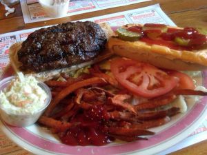 They come on a freshly baked French sandwich roll, and they make the burger shaped to fit it. It’s capsule shaped, and seared with a fine grill crust that brings memories of summer when you bite into it. Just juicy enough and full of classic beef flavor, topped with two slices of American cheese melted to the roll and optional lettuce, tomato, and pickle, this is a classic roadstand burger with great taste. The roll really helps, crisp on the outside and still soft enough to absorb juices and squish down to make the burger easily edible. They also make great fries, standard and sweet potato. In fact, the sweets are some of the best I’ve had, better than the Cloverleaf Tavern, my previous fave.