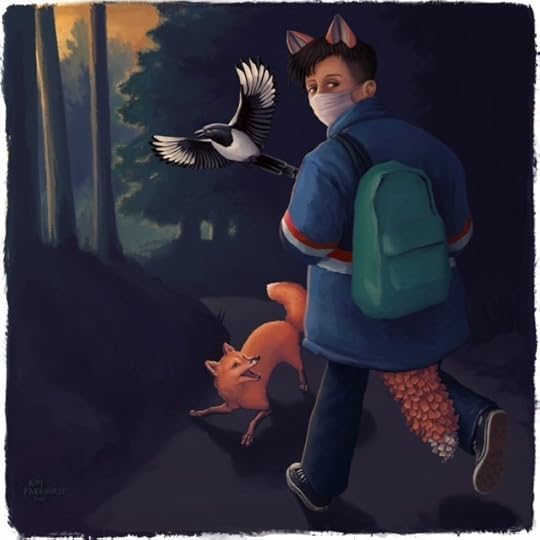 Fox Child Running is my serial short novel on my Patreon page. This one is a pandemic fantasy of our slow apocalypse, of darkness and hope, as young Vix travels across a strange and familiar America after their parents are taken. You can read the first ten chapters for free. That lovely art of Vix and their friends Tod the fox and mags the Magpie is by Kim Parkhurst.