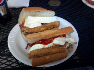 I ordered a breaded chicken cutlet on a hard roll with mozzarella, hot peppers, and balsamic vinegar. The chicken was crisp and tender inside, full of flavor. The mozzarella was creamy with the subtly tart milk taste of the best fresh stuff, comparable to the mozzarella di bufala I had in Napoli. The peppers were not very hot, but did have good flavor, and the sweet vinegar gave it all a little zing. An excellent sandwich, enough for two meals, which I ate one after the other.