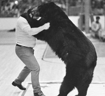 WD: Classic case of open mouth, insert foot … I wasn’t yet 30, had just made 2nd Shift foreman at the factory where I worked. I was 6’1″, about 265, in pretty good “big guy” shape and had a reputation of sorts around the shop for the strength I displayed during the course of doing my production work before going into management. At a large nearby shopping mall they were featuring, as an advertising gimmick for some event, Tuffy Truesdale and Victor “the wrestling bear”, who had been featured as part of AWA pro wrestling shows around the Midwest. Tuffy and Victor were at the mall over a three-day weekend putting on three shows a day, part of which included challenging guys to come out of the audience and wrestle Victor. One night at work, I made the comment that it might be fun to go accept that challenge for the sake of having something to tell the grandkids — BOOM! just like that I was locked into following through …