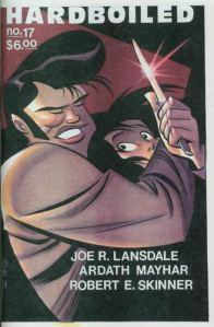 Hardboiled was born in the summer of 1985. We paid a penny a word on publication. Todd Moore, a local high school teacher I had gotten to know who was an “outlaw poet” and also a writer of Jim Thompson-style prose, agreed to assist me. He did story editing, wrote features and reviews, helped with collating; I shared in editing chores, did the layout and typing (yes *typing*, not PC or word processor, and even a MANUAL TYPEWRITER at first – I didn’t upgrade to an electric typewriter until the third or fourth issue). I even did most of the illustrations for the early issues … I was totally up front right from the get-go: Hardboiled was a paying market for all writers and it was also a showcase for my own material and a way to get my name out in front of people … We did twelve issues before handing HB over to Gary Lovisi, who continues to put out the magazine yet today. We featured well-known and also new writers, many of whom went on to bigger things, and whose names you would easily recognize. I’m proud of every issue we put out. Hardboiled did everything it was meant to do — except make money. And, really, that was never a big part of the goal anyway.