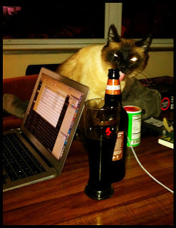 The cat: Charlie T. Cat Esq., aka Charliandoc, aka the Gray Siamesey with the One Bent Paw (he is a rescue, his paw is like a hockey stick, he was tossed out of a car as a kitten and rescued by my sister who found him bleeding from the nose and mouth, and nursed him to beer-label-licking health) P.S. support People For Animals