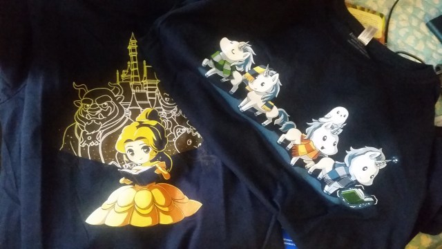 They are navy blue t-shirts, which is not super clear in the picture, but YAY, FUN T-SHIRTS. The left one is Belle (of Beauty and the Beast) reading a book in her signature golden dress, with the Beast and Mrs Teapot and Lumiere ‘imagined’ above her, coming out of the book. The right one is four unicorns with scarves in the colours of the Harry Potter houses. Lil Gryffie ‘corn has a ghost owl on thei...